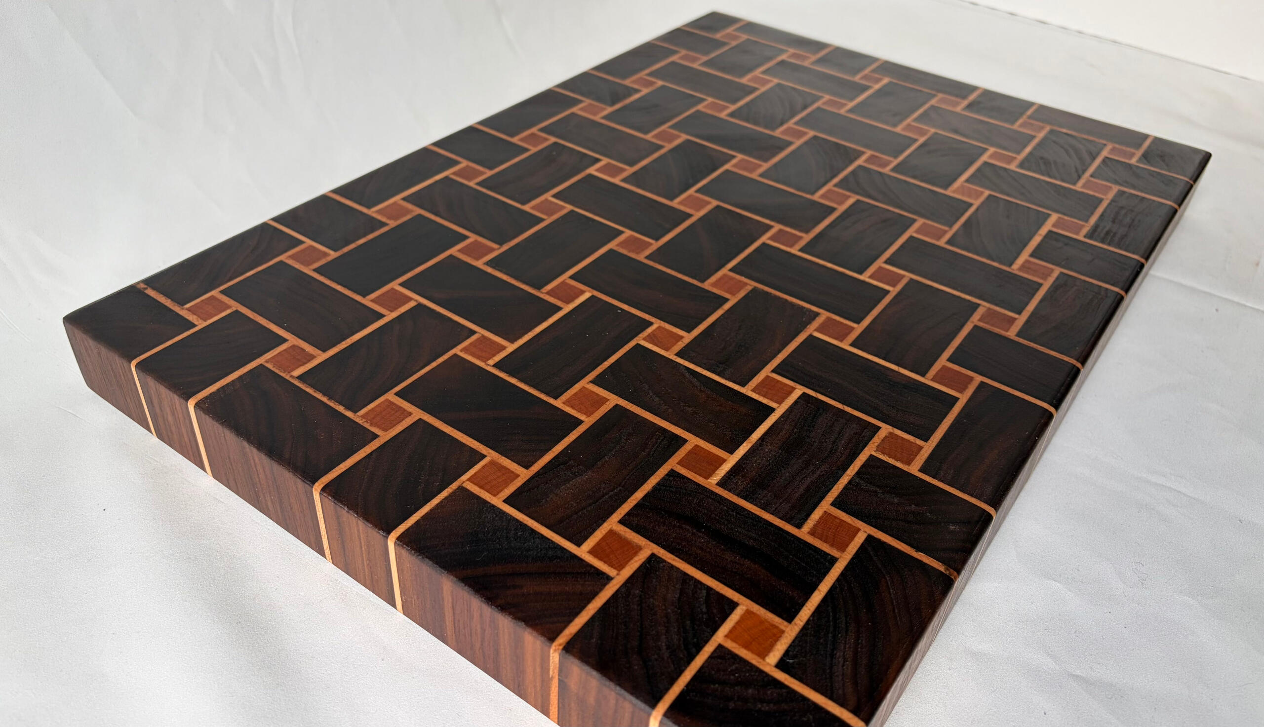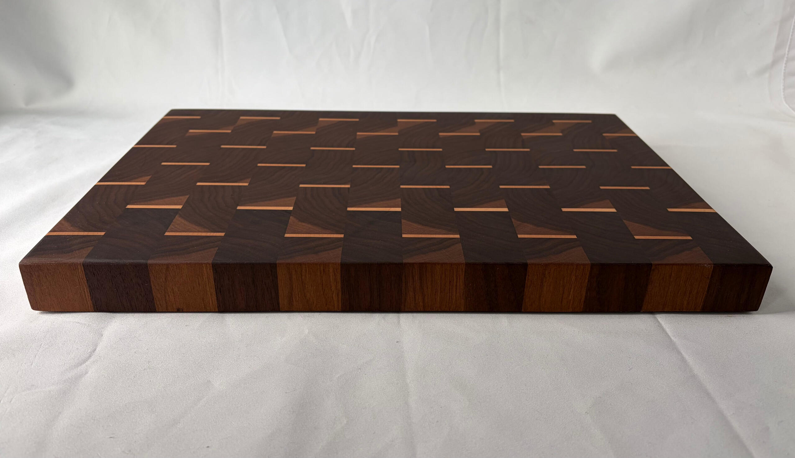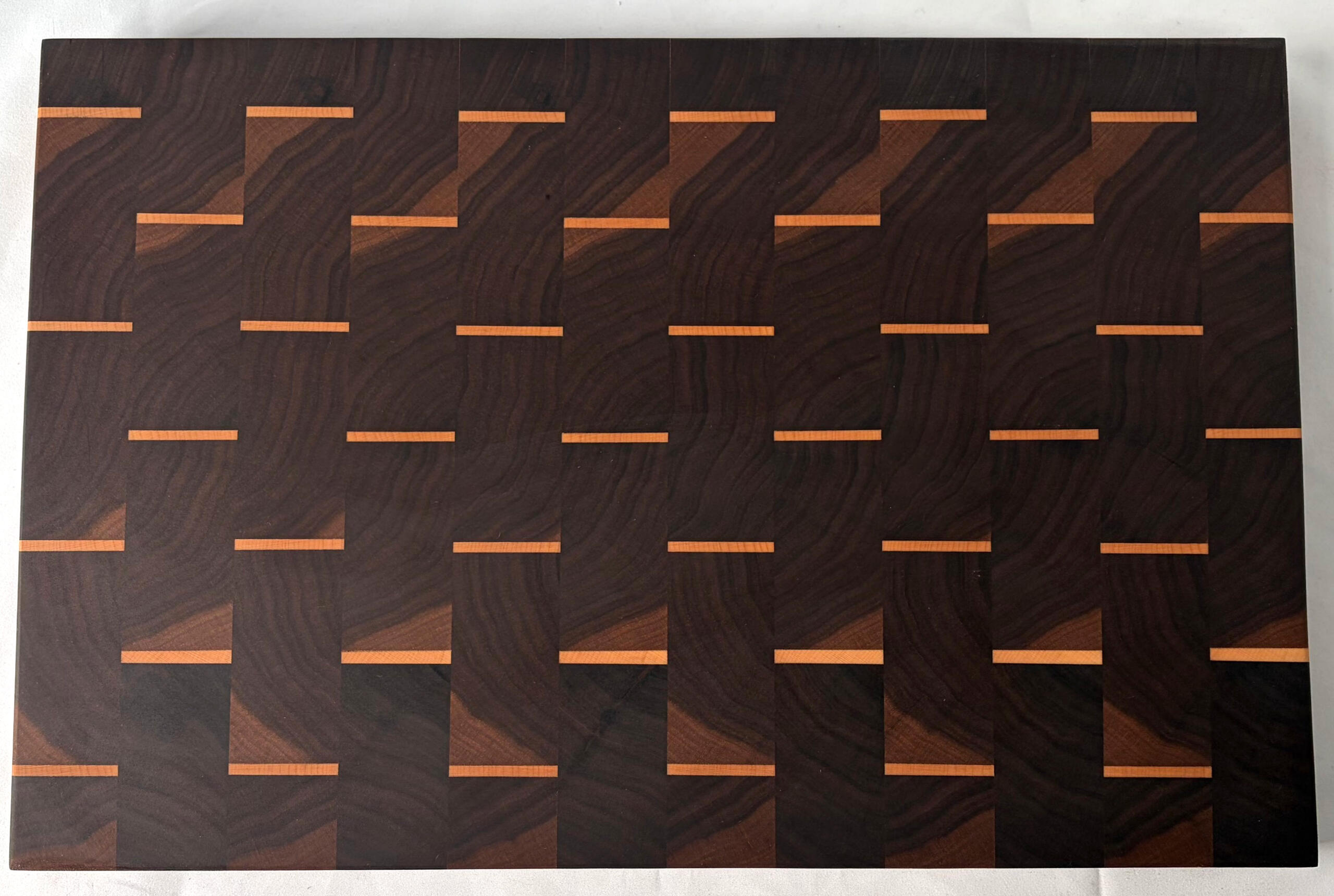Crafted with precision and rooted in tradition, this walnut cutting board features a striking end-grain pattern that blends rich, dark walnut with lighter wood accents. The interlocking design is not only visually captivating but also functional—gentle on knives and built to withstand years of use. Made from premium hardwood and finished by hand, this board is as much a piece of kitchen art as it is a culinary tool. Proudly reflecting Filipino craftsmanship and heritage, it’s perfect for prep, presentation, or gifting.Materials